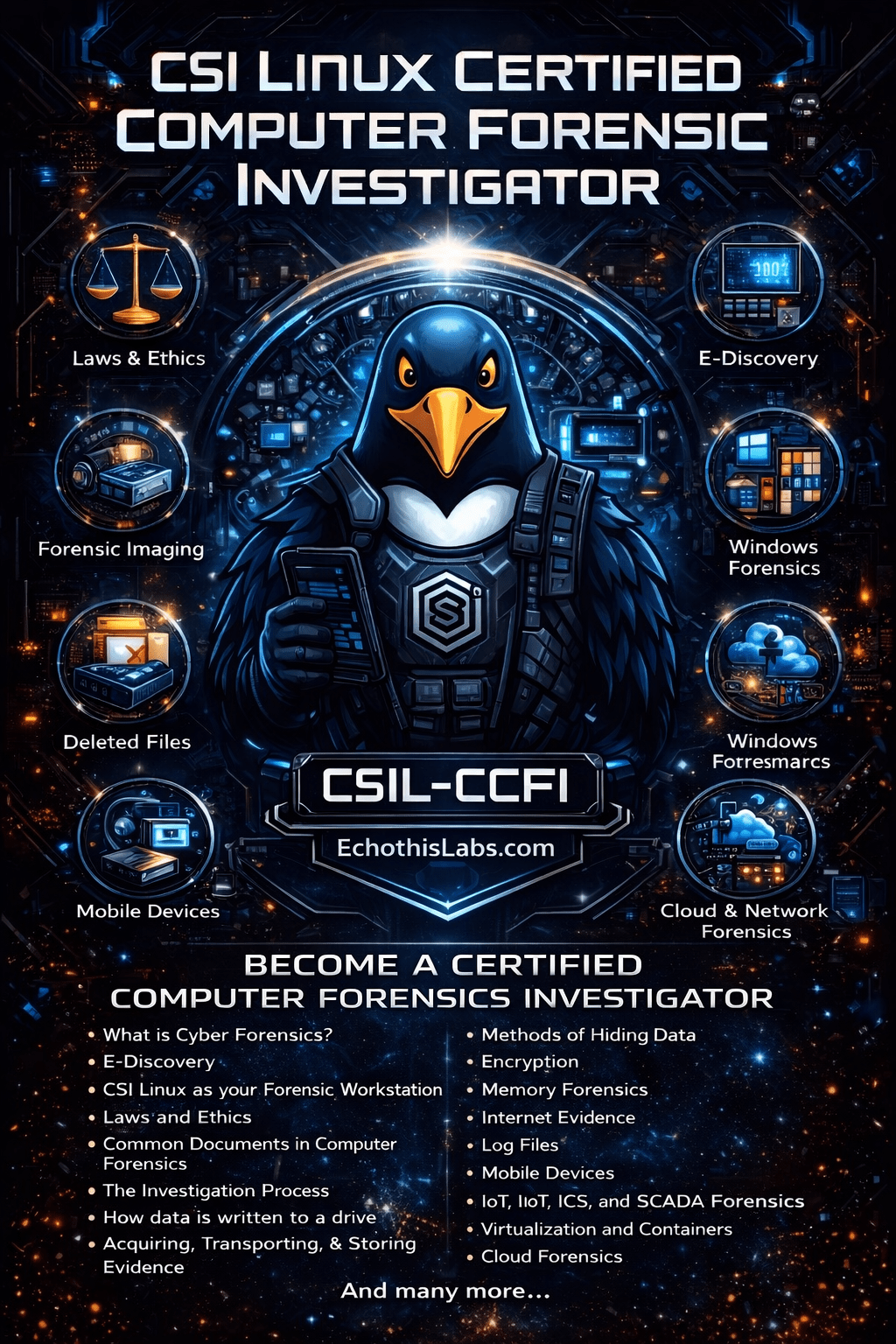 Are you ready to elevate your forensic investigation skills to an elite level? Our instructor-led CSI Linux Certified Computer Forensic Investigator (CSIL-CCFI) course is designed for professionals who want to master digital evidence collection, forensic analysis, and cyber investigations, all while balancing a busy schedule. In just four intensive weeks, meeting twice a week, you’ll learn to acquire, analyze, and present digital evidence with precision. You’ll also gain hands-on experience setting up and using CSI Linux as a forensic workstation, ensuring you’re fully equipped for real-world investigations. From forensic imaging and Windows artifacts to memory forensics and malware analysis, this course prepares you to tackle modern cybercrime head-on. This instructor-led course meets on Tuesday and Thursday evenings, providing a flexible schedule that allows you to advance your investigative skills without disrupting your daily routine. With the CSIL-CCFE Exam voucher, you will also gain access to the online course material containing over 25 modules.